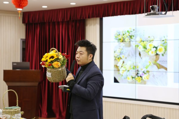 3月8日上午,在一片芬芳的花兒世界中, 插花藝術(shù)創(chuàng)作拉開帷幕。 活動(dòng)特邀中插協(xié)高級(jí)花藝師李政超老師從花藝基礎(chǔ)知識(shí)、花藝色系搭配、花藝制作解析等方面,用各種鮮花向大家細(xì)致地講解了各類花型和每種插花表達(dá)的意境。