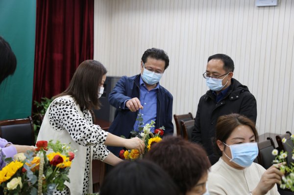 女員工們?cè)诶罾蠋煹南ば闹笇?dǎo)下, 用自己靈巧的雙手, 盡情發(fā)揮創(chuàng)造力,使原本普普通通的花草經(jīng)自己的巧手修剪后,錯(cuò)落有致地搭配在了一起, 插出了漂亮美麗的花束。