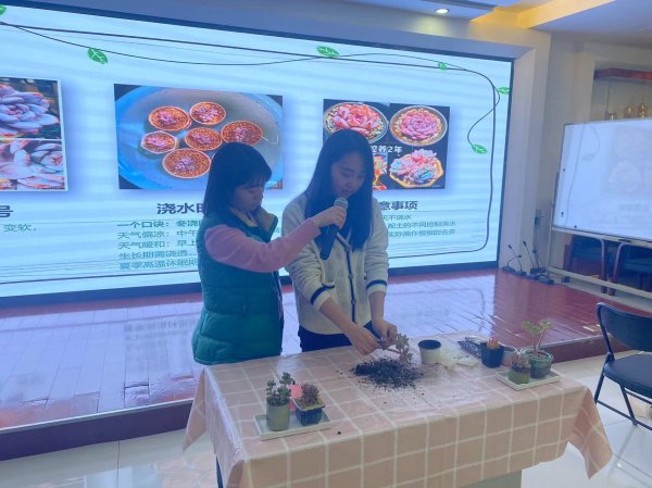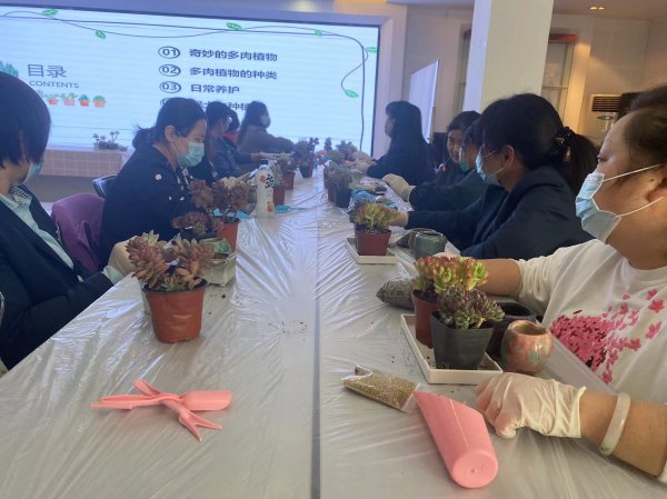 在為期一個(gè)多小時(shí)的時(shí)間里,授課老師對多肉種植和養(yǎng)護(hù)進(jìn)行了全方位的講解和展示,讓在場女職工學(xué)會欣賞多肉,通過圖片不僅認(rèn)識多肉,更從多肉的名稱引申至詩歌,如介紹玉露時(shí),職工會了解到“金風(fēng)玉露一相逢,便勝卻人間無數(shù)”,不僅讓我們的女職工欣賞美,更能受到古典詩詞的熏陶,增強(qiáng)文化底蘊(yùn)。之后進(jìn)行了多肉的種植,淡雪、烏木、綠龜卵、桃美人、火狐貍、福娘,多種款式的多肉植物讓大家直觀的接觸并種植。