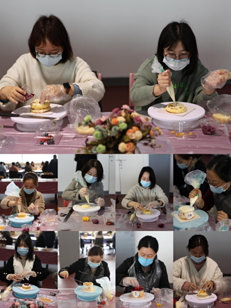 同時,工會還邀請了西點師來帶領女神們自己動手制作精美的蛋糕。從做蛋糕前的準備到蛋胚的擺放,奶油的涂抹,再用新鮮水果裝飾,女神們現(xiàn)學現(xiàn)做,將自己的創(chuàng)意充分地表達在作品中,忙得不亦樂乎。最終,一份份精致的蛋糕作品從每個人手中脫穎而出,收獲了滿滿的快樂和驚喜。