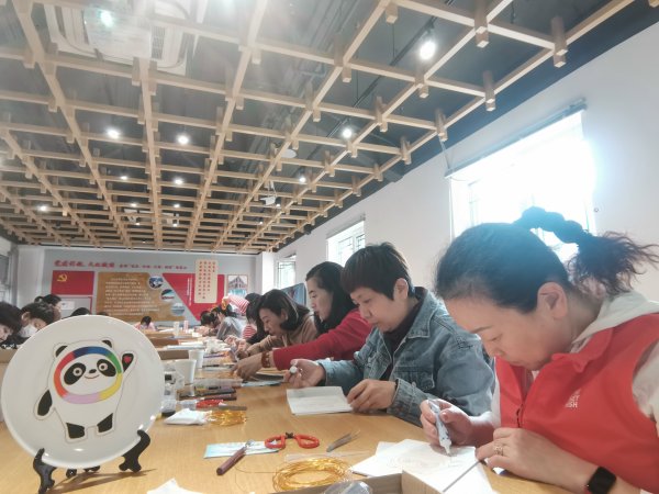 25名女職工代表來(lái)到美后肆?xí)r市民文化中心,老師帶領(lǐng)大家了解中國(guó)傳統(tǒng)工藝掐絲景泰藍(lán)的發(fā)展歷史和景泰藍(lán)工藝畫(huà)的制作方法,并指導(dǎo)女職工們親手制作了一只屬于自己的掐絲琺瑯“冰墩墩”作品。2個(gè)小時(shí)的活動(dòng),掐絲、選色、點(diǎn)藍(lán)、裝裱,女職工們意猶未盡,大家拿著自己制作的“冰墩墩”作品合影留念。