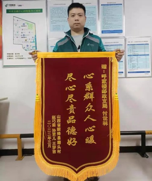 4月6日,朝陽區(qū)分公司呼家樓郵政支局收到一個從山西寄來的快遞,打開一看,竟是一幅寫著“心系群眾人心暖,盡心盡責(zé)品德好”的錦旗,感謝該網(wǎng)點(diǎn)攬投員付世林為他提供的真誠幫助。