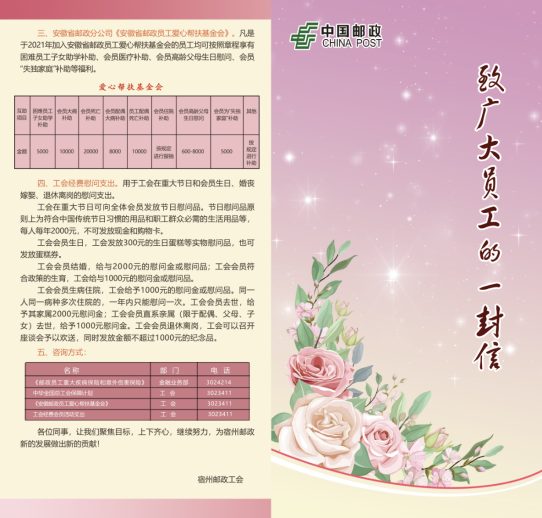 內(nèi)容包含五個方面:一是中郵保險《郵政職工重大疾病保險和意外傷害保險》;二是中華全國總工會《在職職工意外傷害互助保障計劃》《在職職工重大疾病互助保障計劃》《在職女職工特種疾病互助保障計劃》;三是安徽省郵政分公司《安徽省郵攻職工愛心幫扶基金會》;四是工會經(jīng)費慰問支出;五是咨詢方式。