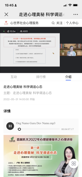 今年4月,直屬機(jī)關(guān)工會(huì)組織開展直屬機(jī)關(guān)員工線上心理測(cè)評(píng)工作,本次測(cè)評(píng)主要圍繞5個(gè)層面11個(gè)指標(biāo)138題展開。廣大員工積極響應(yīng)、如實(shí)反饋,直屬各單位共有6500名員工參與了心理檢測(cè),專業(yè)機(jī)構(gòu)對(duì)個(gè)人及直屬機(jī)關(guān)各單位分別出具測(cè)評(píng)報(bào)告。針對(duì)測(cè)評(píng)中顯示的不同群體的各類問題,5月31日,舉辦“走進(jìn)心理奧秘 科學(xué)調(diào)適心態(tài)”專題講座,講座重點(diǎn)結(jié)合心理測(cè)評(píng)及疫情防控常態(tài)化下員工心理健康情況,通過互動(dòng)體驗(yàn)、視頻圖片、案例分析等講解,幫助員工有效應(yīng)對(duì)工作生活中的壓力、問題和挑戰(zhàn),助力員工提高相應(yīng)認(rèn)識(shí)、掌握相關(guān)技巧、提升心理素質(zhì)。直屬機(jī)關(guān)廣大員工積極參與,5000余人線上收聽收看,500余人次參與互動(dòng)討論。大家紛紛表示,本次授課理論和實(shí)踐相結(jié)合,貼近生活實(shí)際,對(duì)于解決自身存在的心理困惑起到了有效作用,對(duì)自己幫助很大,今后能夠更加坦然、理智地看待心理問題,更好克服負(fù)面情緒,調(diào)整好心態(tài),以更加積極向上的精神狀態(tài)投入到工作和生活中。