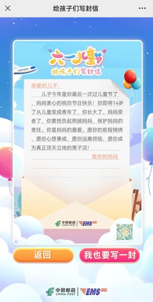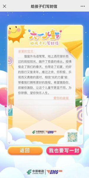 在“六一”國際兒童節(jié)到來之際,寄遞事業(yè)部機(jī)關(guān)工會通過中國郵政速遞物流官微上開展“給孩子們的一封信”線上活動。廣大員工踴躍參與,寫下自己對孩子的節(jié)日祝福和殷切期望。“信件墻”上一封封飽含愛與深情的信件,字里行間表達(dá)了寄遞事業(yè)部員工們對孩子們的關(guān)愛與期盼。特別是在當(dāng)前疫情形勢依然嚴(yán)峻的情況下,勉勵孩子們以積極的心態(tài)面對當(dāng)下的疫情,好好學(xué)習(xí)、鍛煉身體,理解和支持爸爸媽媽履行“郵政人”的使命,大家一起共渡難關(guān)。