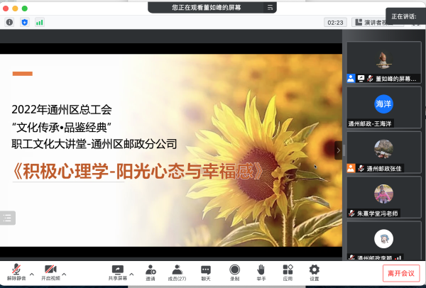 6月13日,通州區(qū)郵政分公司工會積極落實疫情防控要求,借助通州總工會“文化傳承.品鑒經(jīng)典”職工文化大講堂活動,由承辦方朱熹學堂邀請心理專家董如峰老師為全公司50余名全體支行長及職工心理志愿者組織線上第二期心理解壓講座。