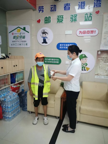 “累了就在郵愛驛站歇息腳,渴了網(wǎng)點(diǎn)員工就為他倒水喝,在這里可以充電、吹空調(diào),儲存和加熱食物,有了小傷小痛還能找到藥品,非常溫暖貼心?!碧崞饟嶂菔谐菂^(qū)分公司南關(guān)村郵政所郵愛驛站,環(huán)衛(wèi)工李師傅總是贊不絕口。李師傅每天負(fù)責(zé)在南關(guān)村郵政周邊的衛(wèi)生打掃工作。當(dāng)前,正值夏日炎炎,他每天在做完手上的工作后,都會到郵政驛站吹吹空調(diào)、歇歇腳。南關(guān)村郵政所的員工及時(shí)為他送上一杯水解解渴。(江西省郵政工會)