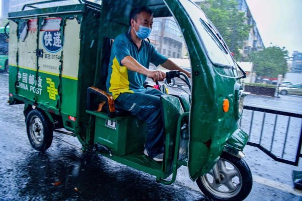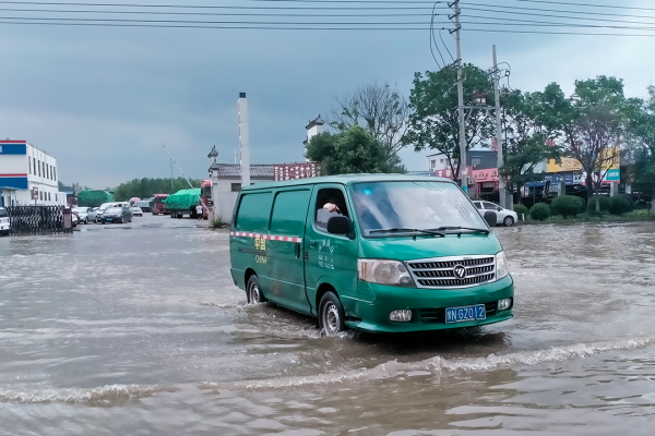 7月5日,夏邑遭遇暴雨侵襲后,市區(qū)道路積水,進入“看?!蹦J?,但綠色郵車依然在大街小巷穿梭,攬投員們馬不停蹄地攬收、投遞郵件。