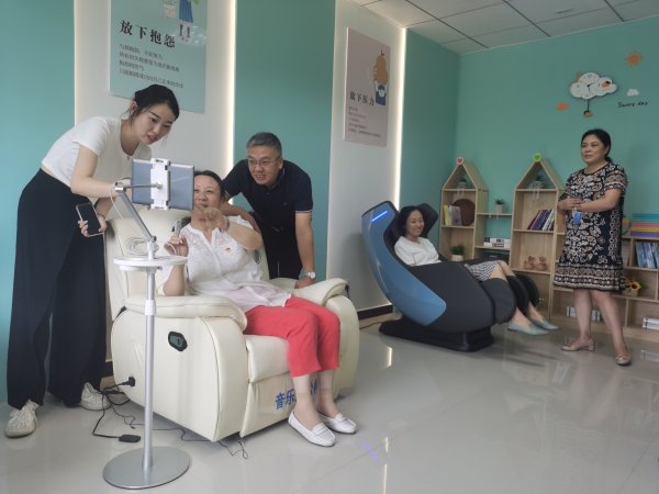 心理減壓室面積約為25平米,具備體感按摩、沉浸閱讀、心理傾訴等功能。內部設有一臺音樂放松椅、兩臺解壓按摩椅和數十種解壓玩具等。