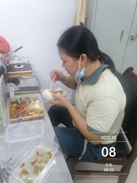 處理完站前投遞部的事情后,朱翠美又馬不停蹄的來(lái)到水南營(yíng)業(yè)部,協(xié)助攬投員卸車、稽核掃描、郵件分揀、掃描下段、郵件裝袋等。中心局也因大部分員工居家靜默管理,進(jìn)口郵件因缺人不能及時(shí)處理,造成網(wǎng)運(yùn)趟車不能按正常時(shí)間、頻次發(fā)車,疫情期間所有攬投部經(jīng)理必須24小時(shí)在攬投部值班,隨時(shí)在崗待命接卸郵件。9月8日,疫情封控第二天,水南營(yíng)業(yè)部郵件分揀下段工作完成后已是晚上8點(diǎn)多鐘了,這時(shí)饑腸轆轆的朱翠美才抽空吃上飯菜早已冰涼的盒飯。