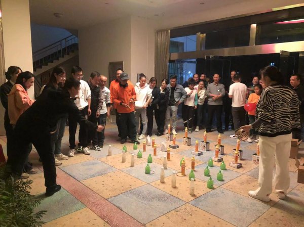 吃飽喝足后,開始了各項(xiàng)趣味游戲。首先是套圈圈游戲,放眼望去,等待的隊(duì)伍早已排成一條長(zhǎng)龍,周圍聚滿了加油喝彩的觀眾,歡聲笑語此起彼伏,不絕于耳,一個(gè)個(gè)獎(jiǎng)品陸續(xù)被套走,大家心里不亦樂乎。