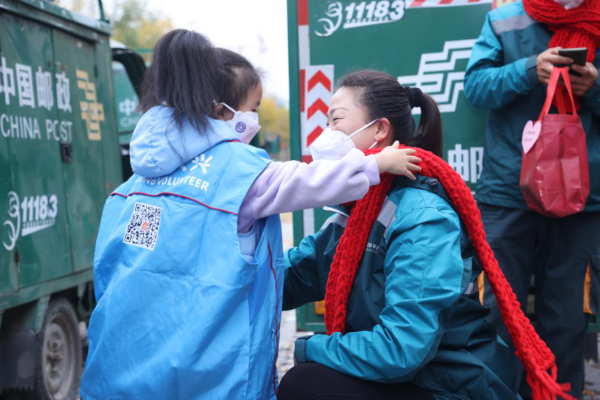 收到禮物的投遞員們很驚喜,也很開心,馬上圍到脖子上試試,與志愿者們合影留念。孩子們更熱情,送上暖貼的時候,大聲地說“你們辛苦了,謝謝你們的付出。”小哥憨憨地笑著回應。