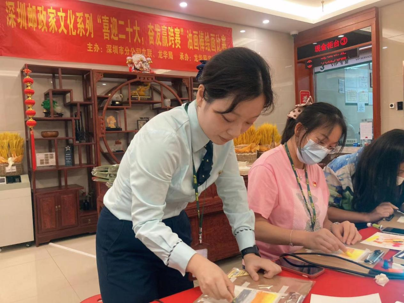 與此同時(shí),深圳市分公司文聯(lián)、龍華局工會(huì)積極籌備,舉辦了“喜迎二十大 奮發(fā)贏跨賽“油畫(huà)棒繪畫(huà)比賽,特邀曾在國(guó)外主修素描與色彩構(gòu)成的濱海營(yíng)業(yè)所員工李露銘同志作為授課老師,為郵政員工及客戶傳授油畫(huà)棒繪畫(huà)技巧。為了使本次油畫(huà)棒繪畫(huà)比賽活動(dòng)順利舉辦,龍華局濱海營(yíng)業(yè)所在上級(jí)工會(huì)的支持下,將“小家”設(shè)備配置更為齊全,賽前為每一位參賽選手配備了一套“油畫(huà)棒繪畫(huà)”專門的工具和紙張。