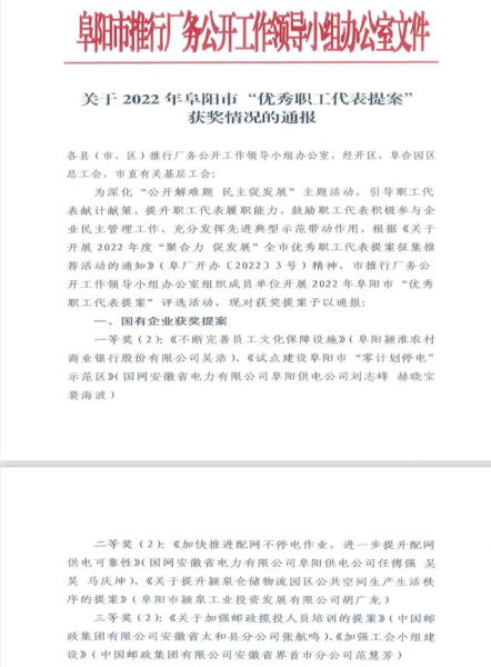 近日,在阜陽(yáng)市2022年度“聚合力 促發(fā)展”全市優(yōu)秀職工代表提案征集推薦活動(dòng)中,太和縣、界首縣郵政工會(huì)上報(bào)的《關(guān)于加強(qiáng)郵政攬投人員培訓(xùn)的提案》及《加強(qiáng)工會(huì)小組建設(shè)提案》,分別榮獲全市國(guó)有企業(yè)提案三等獎(jiǎng)。