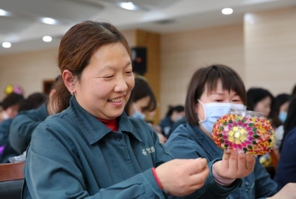 活動(dòng)現(xiàn)場(chǎng),手作老師介紹了粘貼方法及注意事項(xiàng),并進(jìn)行了詳細(xì)指導(dǎo)。女職工們分別在燈罩上用彩色的琉璃片和玻璃珠粘貼出了理想的圖案。繽紛五彩的琉璃玻片在指尖飛舞,一個(gè)個(gè)藝術(shù)創(chuàng)作天馬行空,多姿多彩的花紋,寄托了大家對(duì)美好生活的希冀和憧憬。