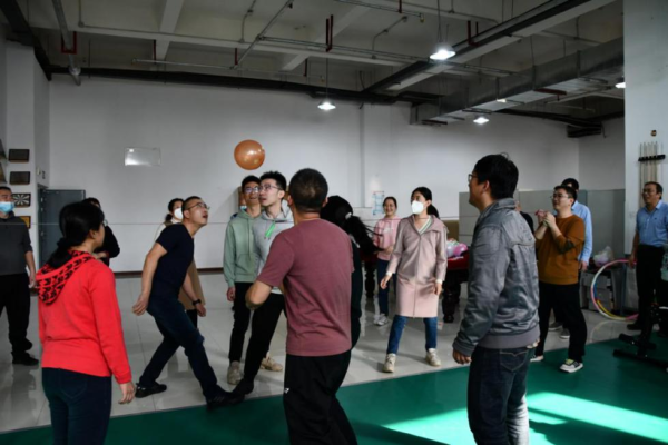 第一個“貪吃蛇”項目,要求每隊全員參與,每個人把雙手搭到前面成員的肩上排成長列,所有隊員步調(diào)一致,在地上一排氣球中蜿蜒穿行。只有做到了齊心合力,才能保證全隊回到終點。本場比賽兩隊競爭激烈,旗鼓相當(dāng)打成了平手。