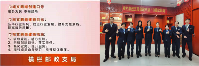創(chuàng)建籌備需要將近1年的時(shí)間,為做好創(chuàng)崗工作,橫欄支局成立“巾幗文明崗”創(chuàng)建活動(dòng)工作領(lǐng)導(dǎo)小組,支局長帶領(lǐng)團(tuán)隊(duì)明確建崗目標(biāo)、建章立制、布置廳堂,將創(chuàng)崗工作融入日常工作中,促使全員積極投入,營造出濃厚的創(chuàng)崗氛圍。