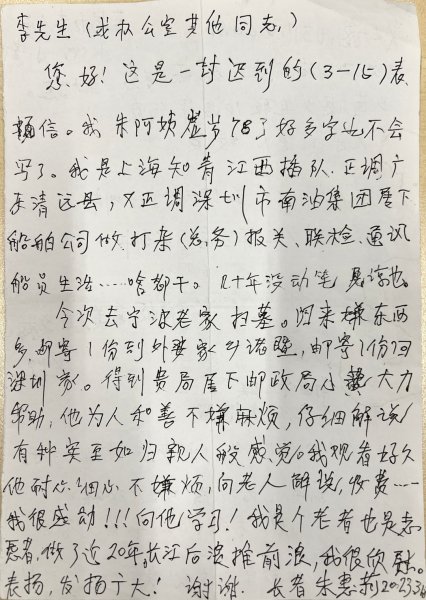 近日,市分公司收到一封表揚(yáng)信,信中表揚(yáng)了浦東新區(qū)分公司張楊路支局下屬?zèng)軚|網(wǎng)點(diǎn)的營業(yè)員陳俊宇。陳俊宇耐心、細(xì)心、貼心的服務(wù)讓上海知青朱阿姨感受到了賓至如歸的溫暖。