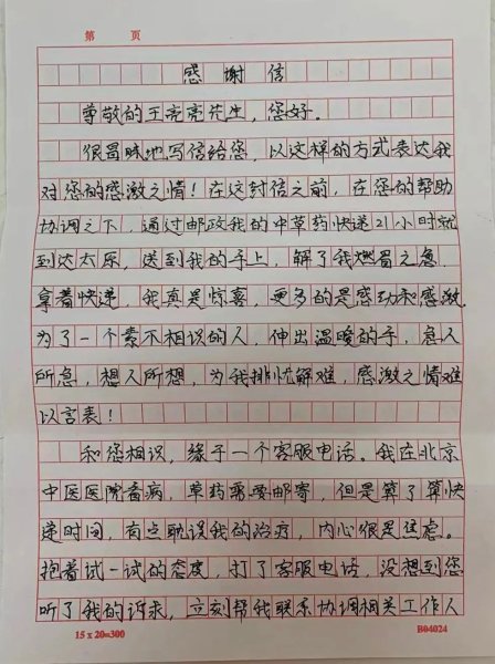 近日,一封由山西省太原市寄出的感謝信送到同城業(yè)務分公司南區(qū)集散客服王亮亮手中。 用戶洪女士飽含深情地感謝在王亮亮的協(xié)調(diào)幫助下,自己21小時就收到來自北京的草藥郵件,解了燃眉之急。