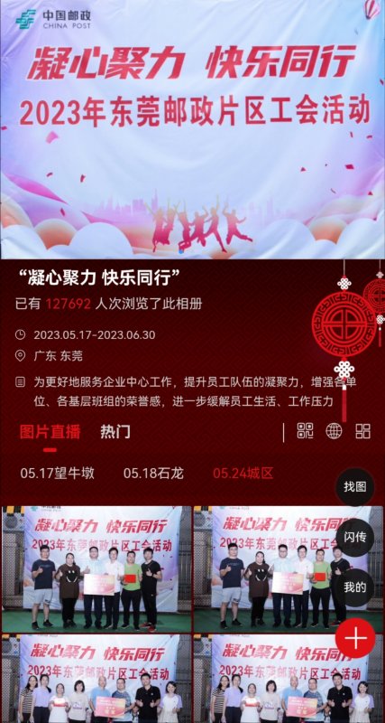與此同時(shí),東莞郵政工會(huì)借助平臺(tái)進(jìn)行了活動(dòng)圖片直播,為員工定格美好時(shí)光,留下歡樂(lè)回憶。截至5月24日第三場(chǎng)片區(qū)活動(dòng)結(jié)束,直播相冊(cè)瀏覽量已超10萬(wàn)人次。