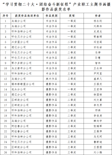 5月25日,由內(nèi)蒙古自治區(qū)國防郵電工會主辦,內(nèi)蒙古郵政工會承辦的“學習貫徹二十大·團結(jié)奮斗新征程”產(chǎn)業(yè)職工主題書畫攝影作品展活動落下帷幕,內(nèi)蒙古郵政職工在大賽中再獲佳績。