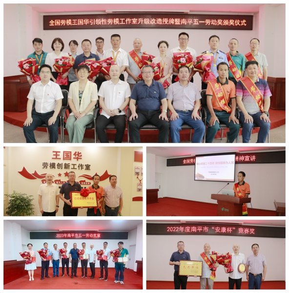 在全國勞模王國華勞模工作室,高文健主席將“引領性勞模工作室”牌匾鄭重地交給了全國勞動模范王國華手中,他在祝賀中希望王國華勞模工作室要不斷建立和完善建設機制,找準工作的切入點、著力點和突破點,積極探索建好用好勞模創(chuàng)新工作室,進一步弘揚勞模精神、勞動精神、工匠精神,發(fā)揮好勞模先進領頭雁作用,進一步引領調動廣大職工的積極性、主動性、創(chuàng)造性,為順昌縣經(jīng)濟發(fā)展戰(zhàn)略實施匯聚更大合力,大力推動人才、文化、生態(tài)、組織全面振興,讓勞模出彩行動在高質量發(fā)展中更加閃耀?;顒油瑫r進行了南平市五一勞動獎章和安康杯獲獎單位及個人的頒獎,順昌縣分公司王新宇、張志榮及其他行業(yè)先進個人上臺領獎。
