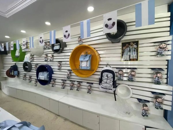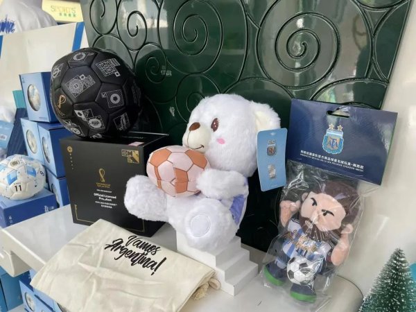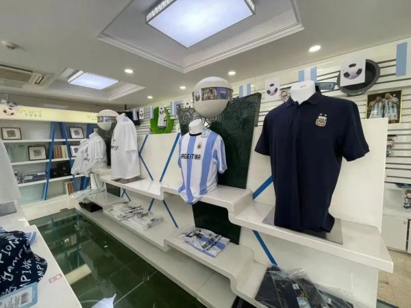 走進(jìn)體育郵局,店內(nèi)已經(jīng)掛滿(mǎn)阿根廷隊(duì)的彩旗裝飾,阿根廷隊(duì)的經(jīng)典照片也被擺放在柜臺(tái)之間,球迷們?cè)诖丝梢再?gòu)買(mǎi)到印有阿根廷足協(xié)標(biāo)識(shí)的助威T恤、阿根廷官方版畫(huà),印有梅西名字和10號(hào)的圍巾、帽子及阿根廷藍(lán)白配色的杯子、水壺、手辦和毛絨玩具等55款授權(quán)商品。