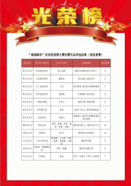 截至6月20日,全市共征集參賽短視頻作品23件,經(jīng)過評委會(huì)投票評選,有12件參賽作品通過初賽,成功晉級復(fù)賽。根據(jù)本次大賽評選規(guī)則,上述晉級復(fù)賽的作品目前已在“中國郵政集團(tuán)有限公司包頭市分公司”(藍(lán)V認(rèn)證)抖音官方賬號開始播放,然后根據(jù)發(fā)布后9天的“播放量+點(diǎn)贊量”和專家評委的打分成績,評選出獲獎(jiǎng)作品。