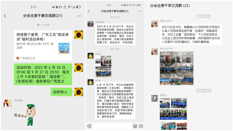 此外,在省總工會“智送清涼”活動啟動前,中山市郵政工會已通過微信群、工作群積極宣傳發(fā)動,做好鋪墊工作,讓廣大員工在炎炎夏日享受更多省總清涼福利。