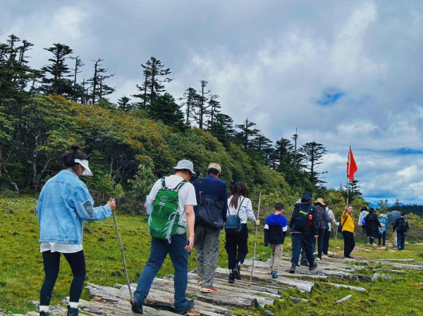 本次活動(dòng)由州分公司黨委書記周旭東、工會(huì)副主席張文中帶隊(duì),機(jī)關(guān)全體職工參與。早上7:10大家身穿戶外運(yùn)動(dòng)裝備早早的來到了公司大院,齊心協(xié)力把后勤保障物資裝車,7:30準(zhǔn)時(shí)坐車前往小中甸鎮(zhèn),上午8:30左右到達(dá)小中甸鎮(zhèn)團(tuán)結(jié)村,從團(tuán)結(jié)村出發(fā)徒步前往千湖山,大家精神飽滿,闊步向前,奮勇爭先,依次沿著徒步路線,走過高山、原始森林、草墊、牧場......雖然天氣變得有點(diǎn)炎熱,但大家一路互相鼓勵(lì),談工作、談家庭、拍照、興高采烈,徒步兩個(gè)小時(shí)左右到達(dá)高山牧場。