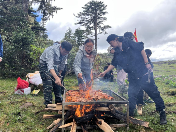 到達(dá)高山牧場大家準(zhǔn)備午飯,有的生火、燒烤……忙的不亦樂乎,絲毫看不到疲憊的感覺,經(jīng)過大家齊心協(xié)力,美味的原生態(tài)燒烤出爐了,大家都吃的津津有味。吃完午飯,繼續(xù)徒步兩個(gè)小時(shí)到達(dá)千湖山,行程大約15公里左右。
