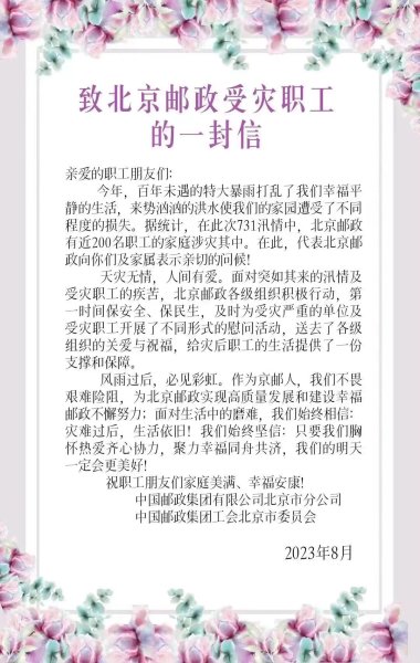 在今年北京市遭遇臺風襲擊,全市普降大暴雨、特大暴雨,北京多地發(fā)生洪水、泥石流、塌方等災害頻發(fā),門頭溝區(qū)、房山區(qū)等地區(qū)災情嚴重造成較大損失之際,北京郵政各級工會時刻將職工的安危放在首位,傾力做受災職工的堅強后盾,努力解決后顧之憂。