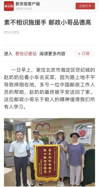 “今天幸虧遇到了您這樣的熱心人愿意幫助,要不我自己都不知道該怎么辦了?!崩先艘贿吜鳒I,一邊拿出一沓現(xiàn)金往劉東升手里送?!按髬?,這錢我不能收,誰都有遇到難事的時候,能幫一把幫一把?!眲|升婉言謝絕了老人的酬謝,并寬慰其安心養(yǎng)病。在老人的一再堅持下,他留下了自己姓名、電話和工作單位。沒過多久,老人的女兒、外孫女便帶著錦旗登門致謝?!澳鲃由斐鲈謳椭夷赣H,真的是太感謝了!中國郵政不愧是國企,值得百姓信賴,培養(yǎng)出來的員工也是好樣的!”老人的女兒眼含熱淚說,今天特意帶自己的女兒來這里學(xué)習(xí),女兒是新京報的小記者,一定要把這樣的正能量傳播出去。