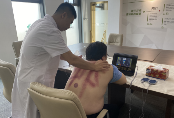張東大夫為職工們一對一診脈,并進行了有針對性的拔罐、推拿、刮痧、經(jīng)絡調(diào)理、穴位埋針等理療項目,同時適時向大家普及職業(yè)病常見調(diào)理方法、保健操、頸椎操、食療保健和四季養(yǎng)生知識等等,通過宣傳未病先防的傳統(tǒng)中醫(yī)理念,喚起職工們的健康意識,切實提升工作和生活質(zhì)量。