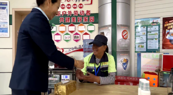 在沙坡頭區(qū)郵政分公司中心營業(yè)廳“愛心驛站”,營業(yè)員為一名環(huán)衛(wèi)大姐倒上一杯水,為她提供充電服務(wù),并提醒以后有需要可以隨時到營業(yè)廳熱飯、充電、喝水等等,“這個‘愛心驛站’真好,還能給我們提供歇腳喝茶的地方,真的為我們提供了很多方便?!边@位大姐感動地說。