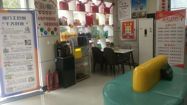 在驛站內(nèi),各營業(yè)網(wǎng)點提供了工具箱、雨傘、應(yīng)急藥箱、針線包、書刊架、抽紙、打氣筒、飲水機、微波爐、多功能充電器等設(shè)備,為戶外工人提供遮風(fēng)避雨、歇腳休息的場所,確保他們“冷有地方取暖、熱有場所納涼、渴有熱水供應(yīng)、累有站點歇腳”。飲水、熱飯、閱讀、休息、充電等便民服務(wù),讓各網(wǎng)點愛心驛站成為了戶外工人的“第二個家”。