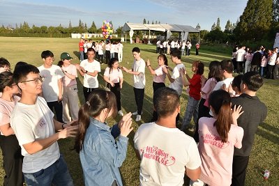 在寬闊的戶外草坪上,青年男女們圍成四個(gè)小圈,開(kāi)展“我們是最棒的”互動(dòng)小游戲,手持五彩氣球,放飛青春,放飛愛(ài)情,當(dāng)五彩氣球飄向蔚藍(lán)天空時(shí),一個(gè)個(gè)斑斕的夢(mèng)在此刻綻放。