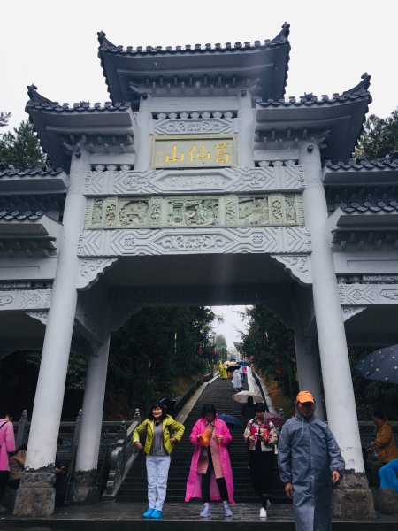 11月11日上午,盡管天空下著蒙蒙細(xì)雨,但大家的熱情不減,或打著雨傘,或穿上雨衣,勇敢地向葛仙山最高處葛仙殿進(jìn)發(fā)。細(xì)雨中的葛仙山,可謂“水光山色依舊是,風(fēng)光綺麗好宜人”。從山腳到山頂大約有 15華里的山路,下了纜車(chē),路途已過(guò)半程,循著臺(tái)階拾級(jí)而上,越往上爬則越有登臨仙境之感,在云霧迷蒙中,只見(jiàn)遠(yuǎn)處峰巒簇迭在云霧中時(shí)隱時(shí)現(xiàn),近處的林木層巒聳翠,淡濃交錯(cuò),深淺相宜。一路上,大家相互鼓勵(lì)、相互扶持,遇上云山霧海的景色,時(shí)時(shí)打卡拍照,歡聲笑語(yǔ)不斷。經(jīng)過(guò)一番努力,成功登頂?shù)穆毠?,感受著雨后葛仙山的別樣的美景。