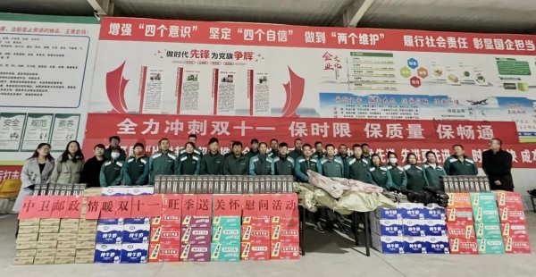 2023年11月8日,市分公司黨委、工會開展了“情暖雙十一 旺季送關懷”慰問活動,市分公司領導班子分別對沙坡頭區(qū)分公司、中寧、海原縣分公司金融網(wǎng)點、寄遞攬投部人員、職工小家進行了慰問,為奮戰(zhàn)在旺季營銷生產(chǎn)一線的金融、寄遞人員發(fā)放了慰問禮包。