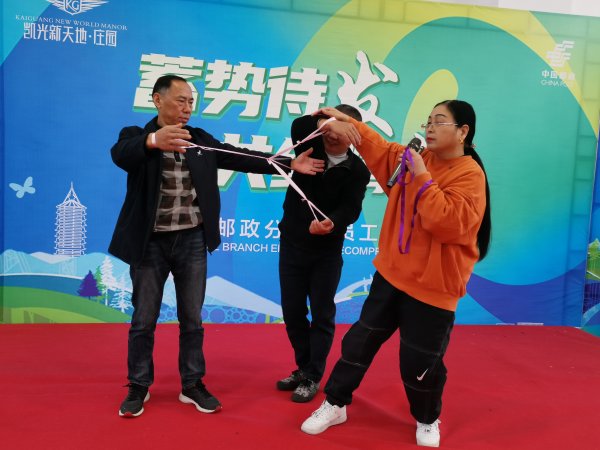 首先老師讓兩位職工代表上臺(tái),各套上兩根繩子在雙手,兩人繩子保持交叉狀態(tài),不能借助剪刀等工具,看如何解開。大家倆倆搭檔,開始嘗試各種方法解開繩子,最后有兩個(gè)女同事率先解開了繩子。老師讓她們演示一遍給大家看,大家看完后都恍然大悟。