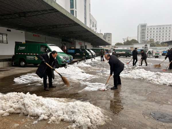 12月18日早晨,浙江湖州下起了大雪,黨員志愿者們自發(fā)到公司大院清掃積雪,為行人和郵車暢行“開路”。