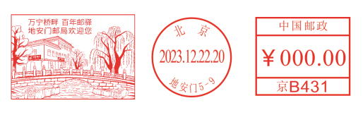 今年是地安門郵局遷入現(xiàn)址20周年,12月22日-31日開展遷址重張20周年紀念活動,正式啟用“萬寧橋畔 百年郵驛 地安門郵局歡迎您”郵資機宣傳戳。該宣傳戳以萬寧橋與地安門郵局房屋建筑為主要圖案,將門前楊柳、橋下鎮(zhèn)水獸、河中盛開的荷花等細節(jié)一一展現(xiàn),突出地安門郵局地域特點和歷史文化積淀。同時,配套印制同圖紀念封一枚。