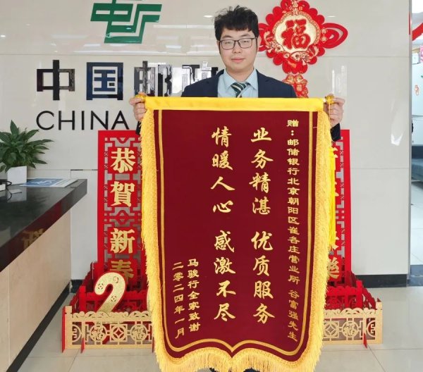 1月2日,中國郵政儲蓄銀行北京朝陽區(qū)崔各莊營業(yè)所一開門便收到用戶馬先生送來的錦旗。馬先生的家人由于行動不便,不能來網(wǎng)點辦理業(yè)務(wù)。見到用戶有難處,綜合柜員谷富強(qiáng)二話不說,利用個人休息時間上門服務(wù),為用戶排憂解難?!稗k理完業(yè)務(wù)后,用戶口頭表示了感謝,但沒想到后來又親自送來錦旗。”谷富強(qiáng)說,用戶的一片心意讓自己覺得既感動又溫暖。