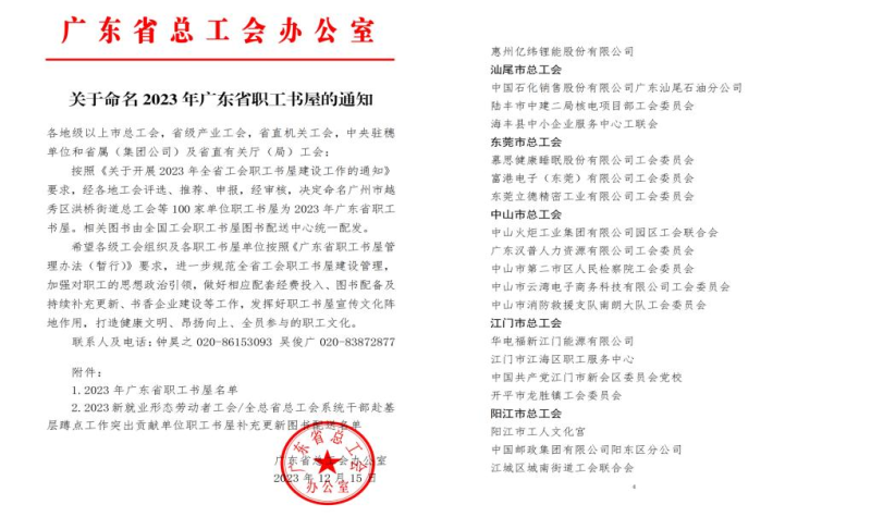 近日,廣東省總工會(huì)辦公室下發(fā)了《關(guān)于命名 2023 年廣東省職工書(shū)屋的通知》,陽(yáng)江陽(yáng)東區(qū)分公司職工書(shū)屋被命名為“廣東省職工書(shū)屋”,這是對(duì)陽(yáng)江陽(yáng)東區(qū)分公司在職工文化建設(shè)和閱讀推廣工作的肯定和表彰。