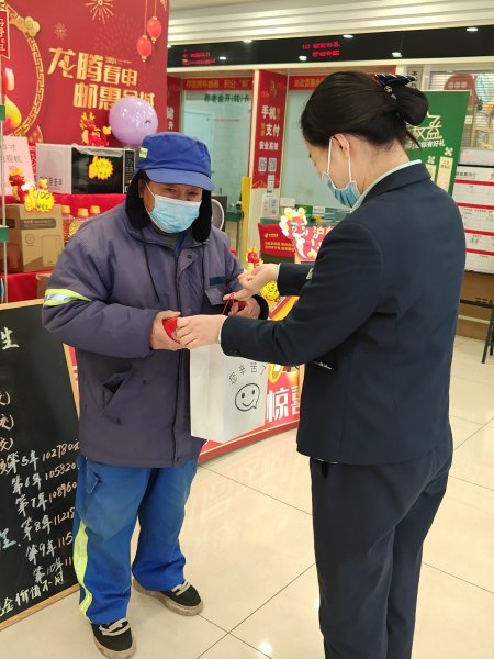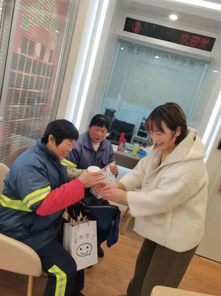 春節(jié)期間,當有環(huán)衛(wèi)工人、快遞小哥等戶外勞動者來愛心驛站休憩時,來自網店的工作人員第一時間將準備好的熱紅糖茶、八寶粥、暖寶寶貼等送到戶外工作者手中,確保戶外工作者在低溫環(huán)境下能夠得到及時有效的防護和補給,并送上了新春祝福。