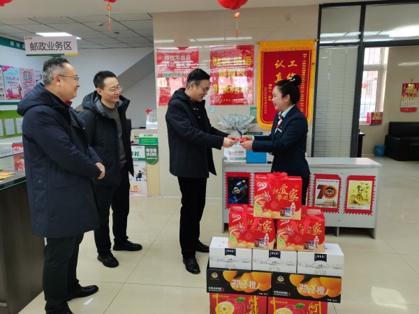 2月1日,省分公司紀(jì)委書(shū)記、副總經(jīng)理胡紅軍一行來(lái)到撫順市分公司,實(shí)地走訪慰問(wèn)郵件處理中心、撫順城支局、李石支局和新?lián)釘埻恫浚瑸橐痪€員工送去關(guān)心和祝福。胡紅軍向一線的員工們的辛勤付出表示敬佩和感謝,囑咐大家在關(guān)注旺季生產(chǎn)的同時(shí)保重身體,注意防寒保暖,并向大家致以節(jié)日的問(wèn)候。