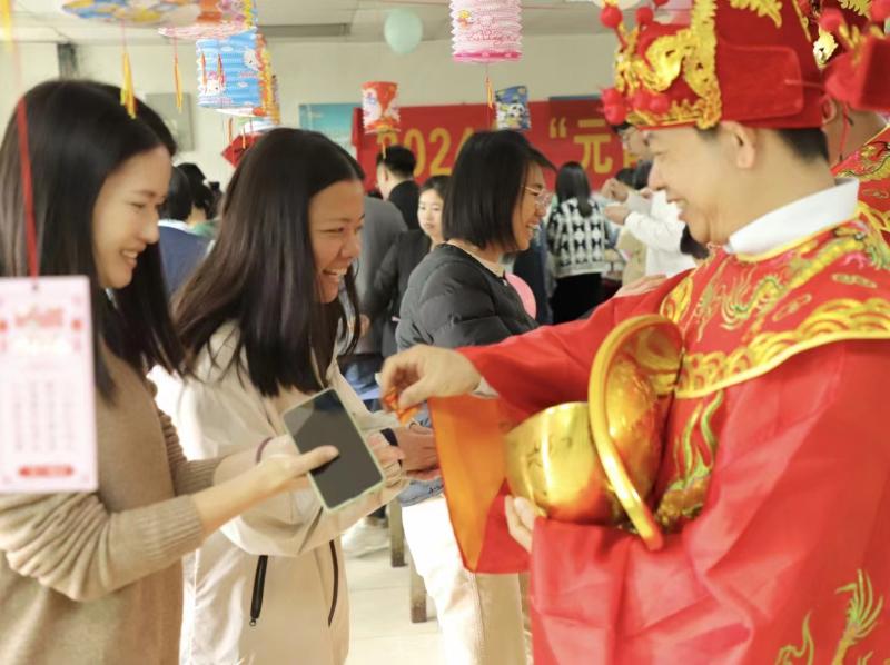 在聯(lián)合會(huì)場(chǎng),猜燈謎區(qū)、小吃美食區(qū)、迎財(cái)神接福區(qū)、制作湯圓區(qū)域都熱鬧非凡,財(cái)神散福時(shí)更迎來(lái)一陣又一陣的歡呼,大家都希望2024年龍行龘龘、前程?hào)T朤、生活鱻鱻、事業(yè)燚燚!