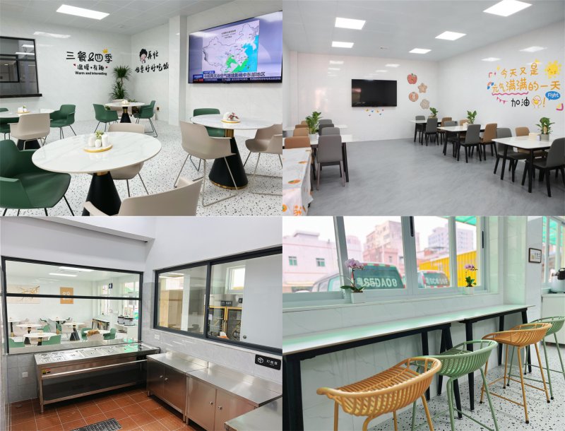 兩個新食堂以簡約裝修為基調,通過重新布局功能分區(qū),新配置用餐桌椅、電視空調等設備,打造出了清新自然的用餐環(huán)境。