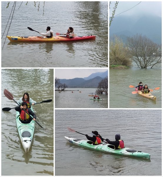 抵達桐洲島后,首先進行的是刺激的皮劃艇體驗項目。大家先在專業(yè)教練的指導(dǎo)下,學(xué)習(xí)了皮劃艇的基本技巧和安全知識;隨后便兩兩組隊,分批登上皮劃艇,泛舟于富春江上,欣賞春日的美景。從初登艇時的手忙腳亂、進退左右不分,到與搭檔磨合熟練后的進退自如、快慢由心,大家在歡聲笑語中悄然增進了彼此的配合與默契。