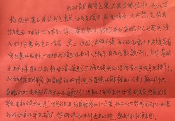 那天,用戶隋阿姨到網(wǎng)點(diǎn)郵寄包裹,物品零碎且重量較沉,龔金鵬一邊指導(dǎo)隋阿姨填寫好單據(jù),一邊快速完成了包裹檢驗(yàn)和封裝工作。再次核對(duì)完郵寄信息后,龔金鵬將單據(jù)交到隋阿姨手中,叮囑其妥善保管。業(yè)務(wù)辦理完沒過多久,隋阿姨又從回家途中折返回網(wǎng)點(diǎn),原來是她沒有戴花鏡,把電話號(hào)碼填錯(cuò)了,剛才核對(duì)時(shí)也沒看出來,回家路上才發(fā)現(xiàn)??吹剿灏⒁探辜钡谋砬?,龔金鵬一直耐心安慰?!鞍⒁?,您別急!包裹還沒寄出,郵寄信息我很快就能幫您改好?!毙薷耐晷畔⒑?,龔金鵬又與隋阿姨認(rèn)真核對(duì)了一遍,服務(wù)中的種種細(xì)節(jié),讓隋阿姨覺得既親切又溫暖。于是,她寫下感謝信,親自送到網(wǎng)點(diǎn)負(fù)責(zé)人手中,表達(dá)自己的感謝之情。